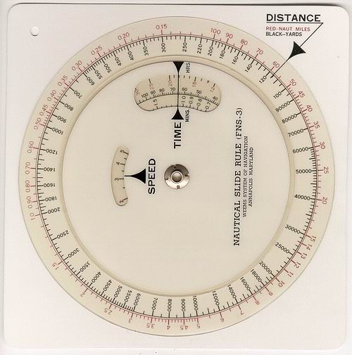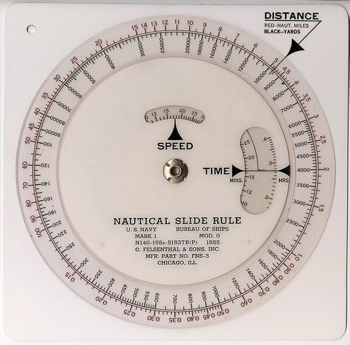 Massive 8 inch diameter circular slide rule, with functions for computing time, speed and distance. Very nice rule, copyright 1955, also marked N140-155s-51537B(P), and FNS-3. A very useful rule, no case was included, back is blank. Bureau of ships Mark 1, model 'O'. (6 scales) |