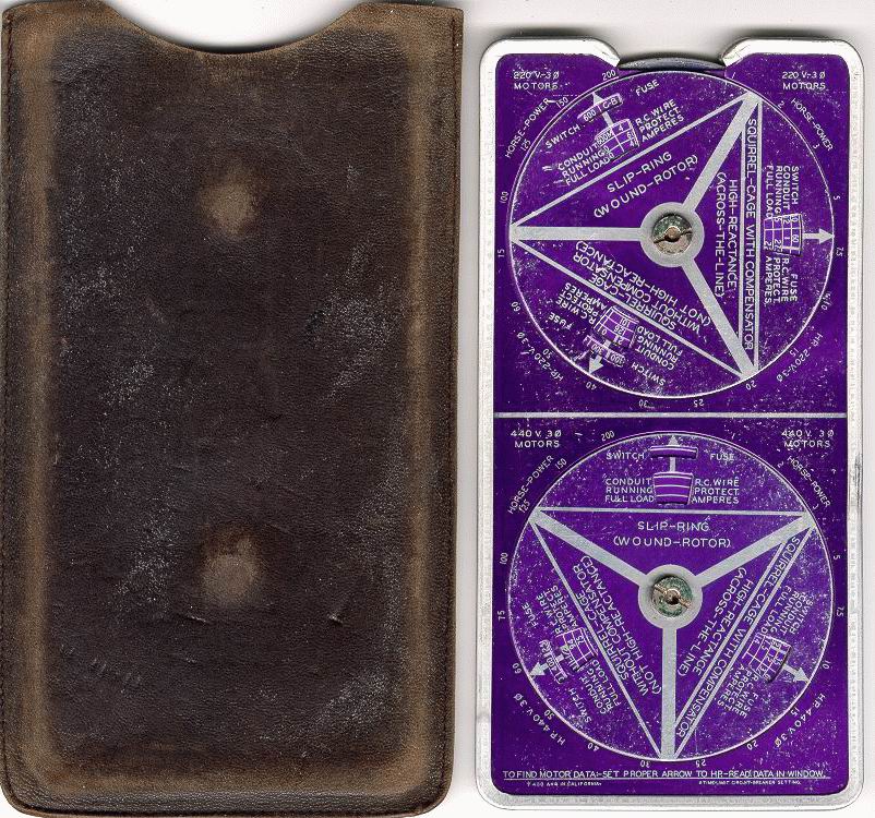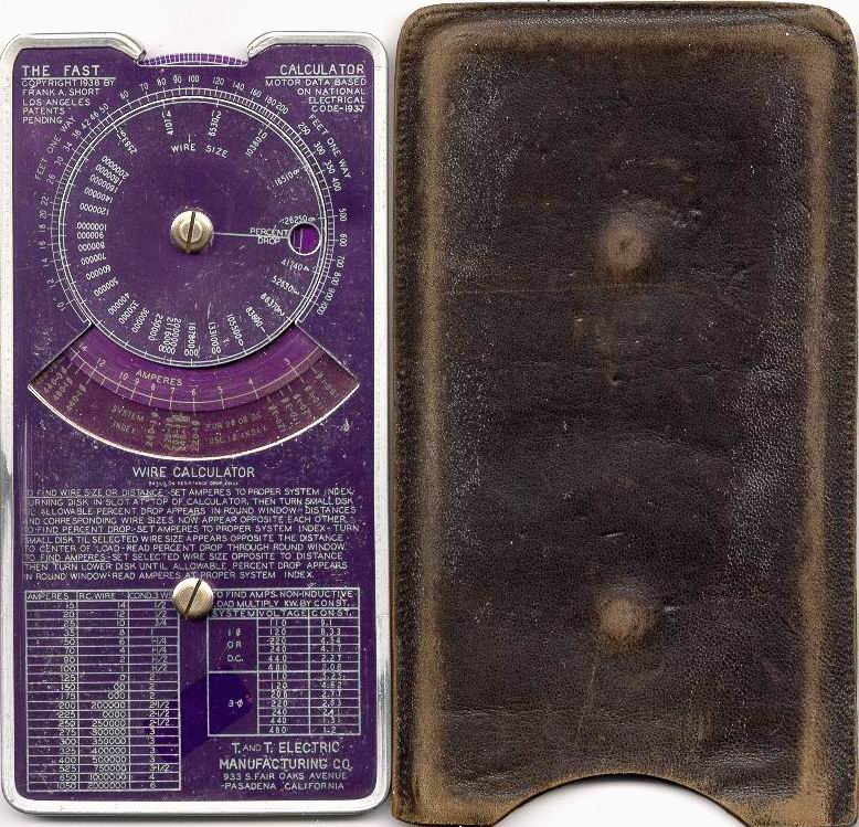 The Fast Calculator Copyright 1938 by Frank A. Short, Los Angeles. Made by T and T Electric Manufacturing Co. A fascinating 7 inch long aluminum multi-wheel slide rule for electrical calculations. Purple anodized scales on aluminum, it does wire sizing, current and drop calculations. The reverse side does motor sizing calculations. 4 rotating wheels total. Very high quality construction, self documenting design with all instructions on the rule body. Has a soft leather slip case. (5 Scales, 1 chart on one side, 2 ea. 5 scale selectors on reverse) |