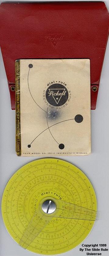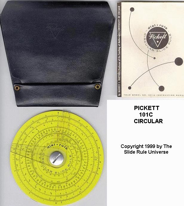 5 Inch Log Log Duplex Circular One of the most uncommon Pickett aluminum circular slide rules, in the popular ES (eye saver) yellow color. Complete with black belting leather case with gold logo, and miniature manual that fits inside the case. Has tracked duplex cursor, (with scale markings), and rotating disk on one side. The unusual two line cursor permits fast circle area calculations between A and D (set the long cursor on D to the diameter, A will show the area on the short cursor). This is a powerful pocket rule, with performance equal to a much larger straight rule. Has extended trig scales and EIGHT log log scales. Has DI scale and doubled CI scale (EI), with six trig scales. This rule's unique construction has laminated engraved and filled plastic bodies on a metal core for mechanical strength and very long wear life. This rule DOES NOT have painted scales like the 101C, it is engraved like a Versalog. The only detracting feature is the previous owner's name neatly inside the flap (Christensen). (10/13 [23 Total] Scales) |