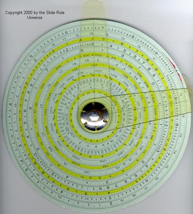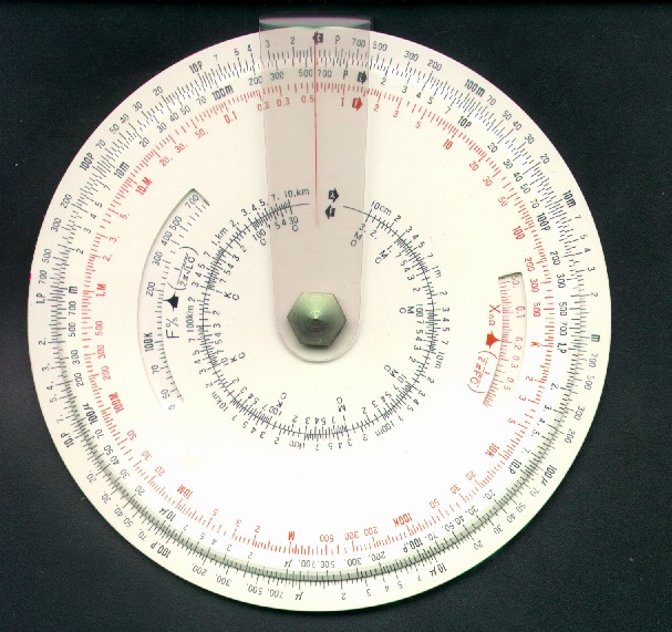 A powerful 4 inch duplex circular slide rule, with dual rotating faces. Very nice rule, complete with vinyl slip case and manual. This is a trig enhanced rule with performance equal to a much larger straight rule. Rotating cursor and 2 disks. (12 Scales) |