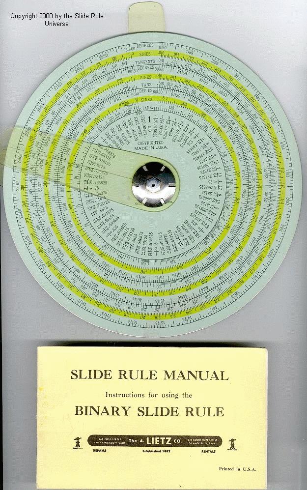 8 Inch Duplex Circular Gilson's most famous aluminum circular slide rule, with alternating yellow/white stripes and fractional converter/operator scales. This rule was made by Gilson (copyright 1940), but sold by numerous other companies, this one has the Lietz manual included, and was sold as a Lietz Binary Rule. This is a very powerful rule, with 3 sets of trig scales (sin/tan), giving performance equal to a much larger straight rule. Coupled with the degrees/minutes format, this high resolution is ideal for navigation or other survey uses. Has many unique scales such as drill and thread plus fractional 'binary' scales that permit operations directly with fractional numbers. Rotating dual cursors/clutch on one side, single cursor on other. (21 Scales !) |