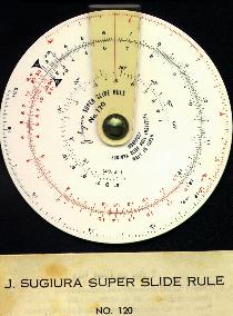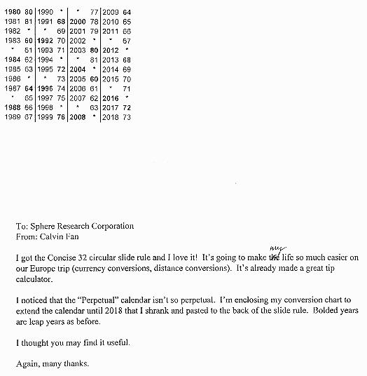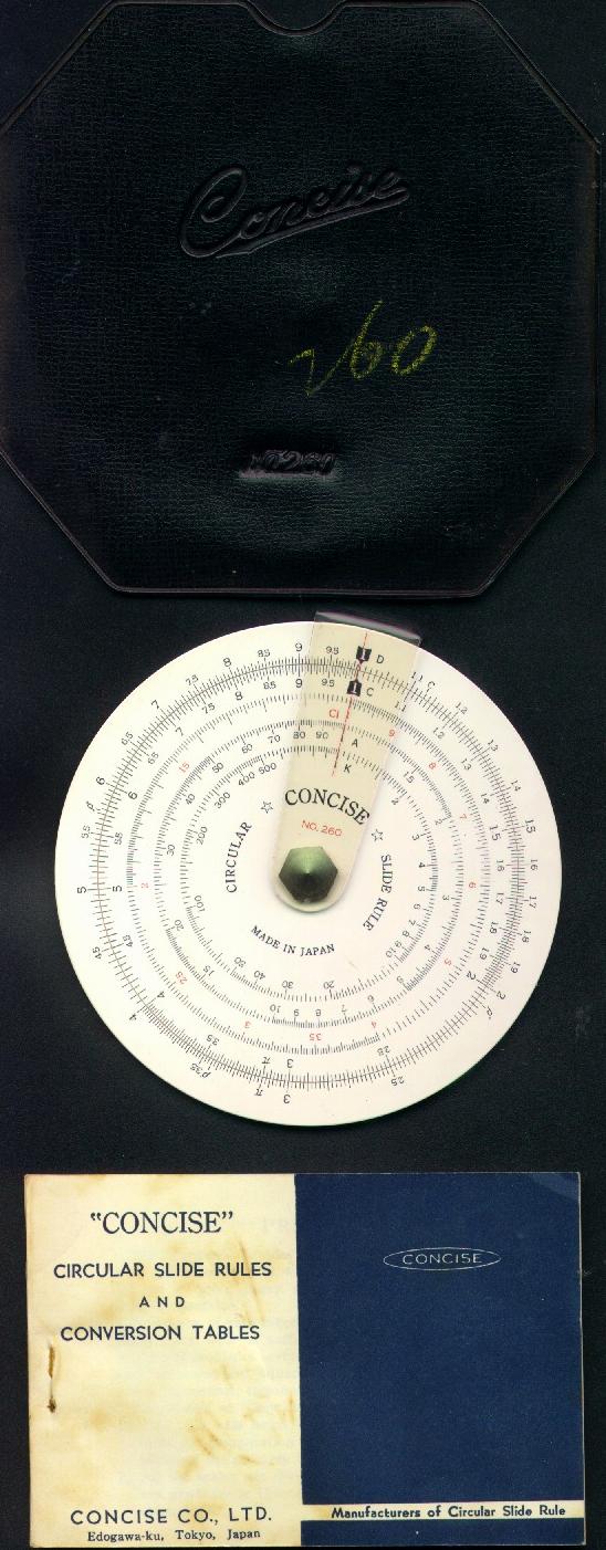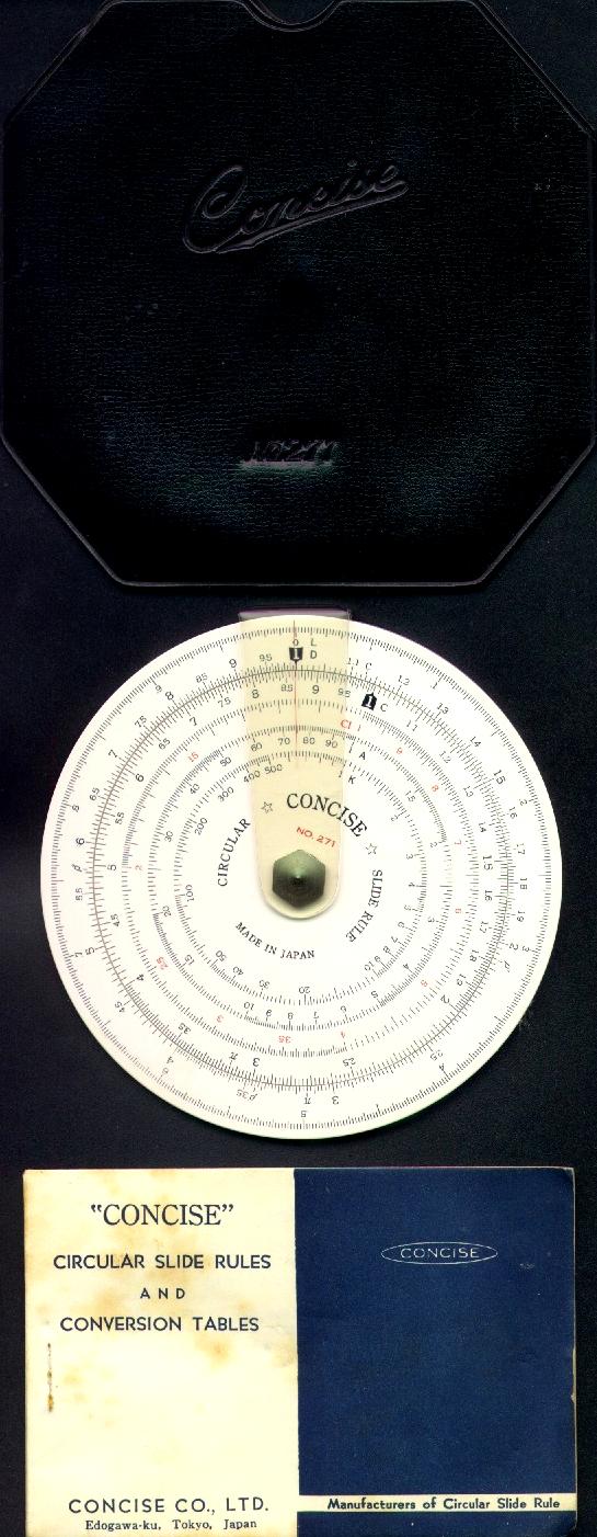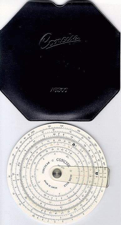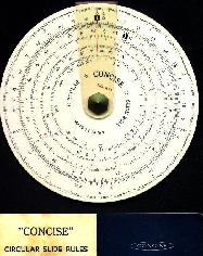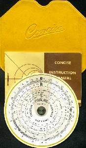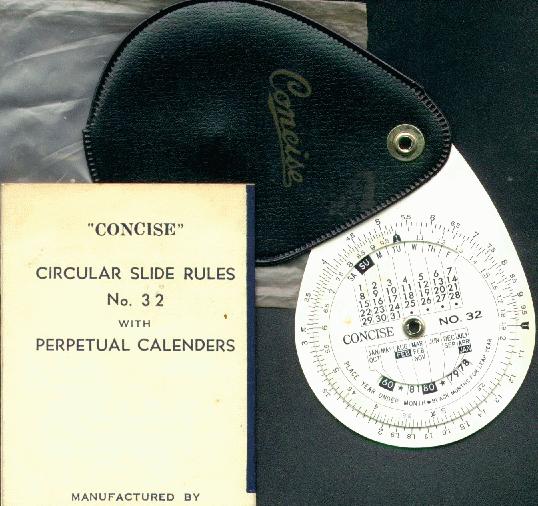 An amazing and tiny patented (479446) 2 inch diameter pocket circular slide rule with Perpetual Calendar, covering 1960 to 1981 (to me, this is not perpetual, but GREAT for fixing historical dates and days). Basic Rule on outside ring has C and D scales, inner windows and grid do dates and days. White plastic rule, complete with attached vinyl slip case and manual. This is a very unusual rule from Concise. Rotating disk, back is blank. CLICK HERE to get Calvin Fan's method for extending the range of the 'perpetual calendar' to 2018. (2 Scales + Calendar) |