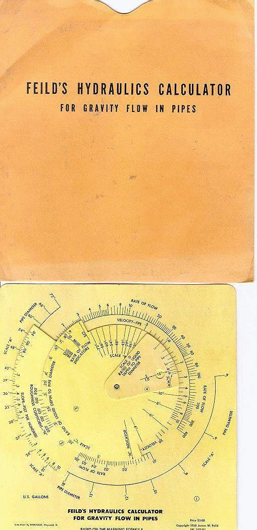 Excellent Condition. A larger 6 inch specialty circular slide rule, made by Perrygraf in the USA. This complex cardboard with 3 rotating parts rule was copyrighted in 1950. This is used for hydraulics calulations involving the gravity flow of water in pipes, based on the Manning Formula. Comes complete with the original paper case, and the reverse side has full instructions for use. (9 Scales + Instructions) Front - see pics Back - Operating Instructions |