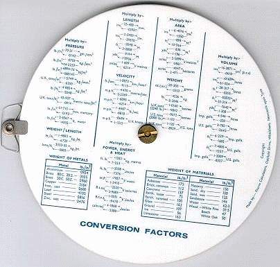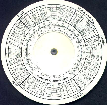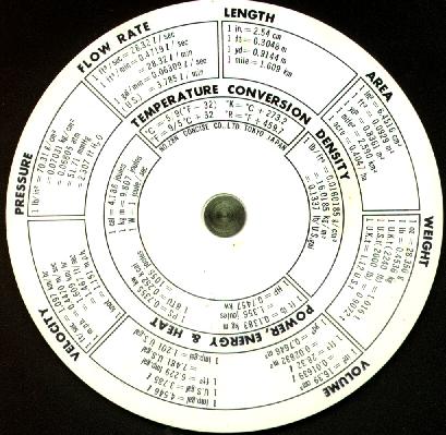 A unique pocket data center and circular slide rule, with extensive unit conversion functions, including ri, acres, litres, carats, chains, tubo, miles, ken, grams, grains, meters, ounces, koku, cubic inches, and MUCH MORE. This double sided data center has conversion factors for all units, which are then entered into the circular rule for your measurement. Great for people that travel or work with international units, especially in Asia or Europe. (5 Scales, and 59 units!) |