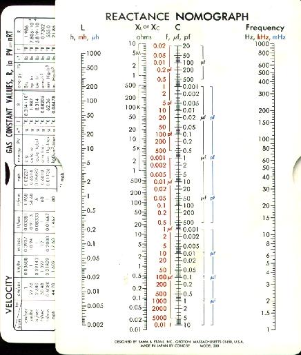 An amazing 60mm pocket circular slide rule, with inch and cm rulers, a complete reactance nomograph on the back, and a double sided pull out card with physical constants, formulas and conversions, plus COLOR CODES, wire gauges, etc.. An electronics textbook in your pocket. (8 Scales) |