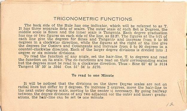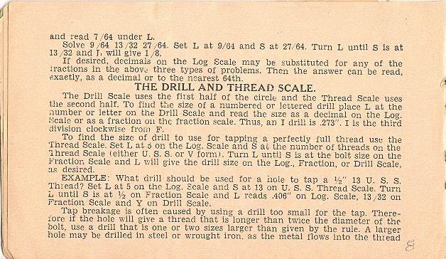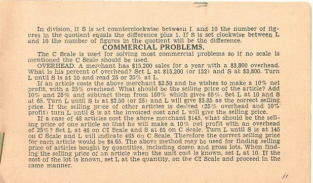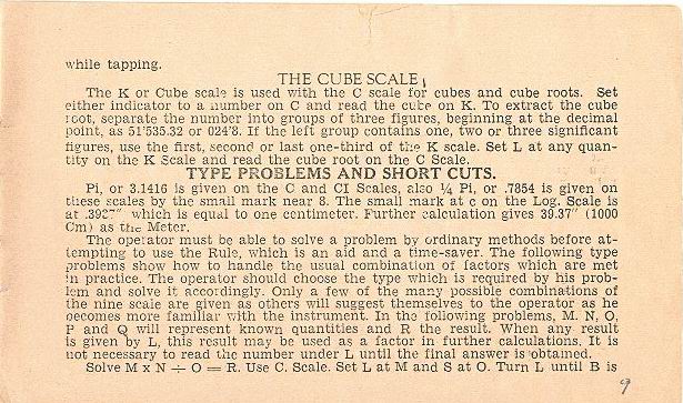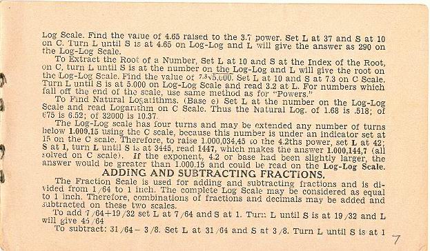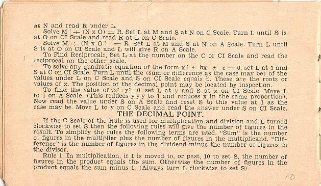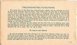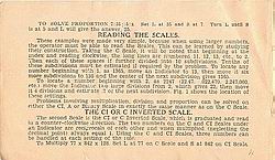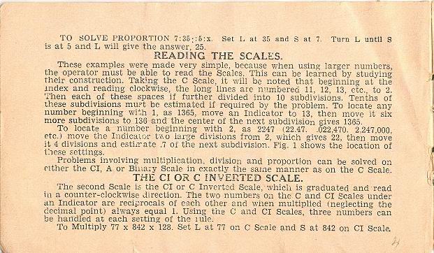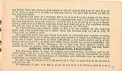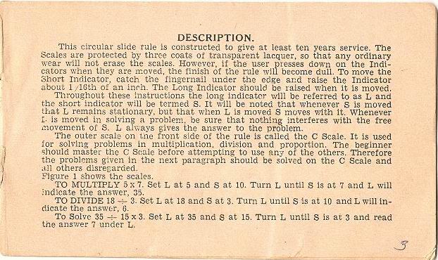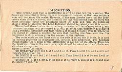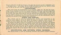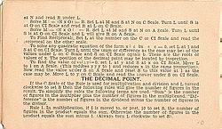 Circular Slide Rule Operating Instructions ![]() CLICK for BIGGER PIC ![]() CLICK for BIGGER PIC This information was freely distributed with new rules, but note that it is copyright by the respective companies. GILSON rules were usually marketed under other names like Lietz, POST, Dietzgen and so on, and the rule does not even have Gilson's name on it. The company was located in Florida, and made some of the most interesting US circular rules. |