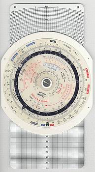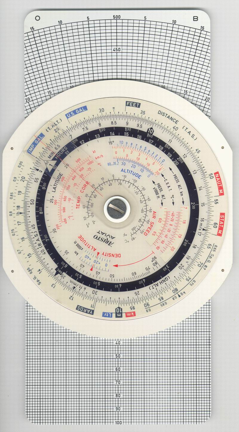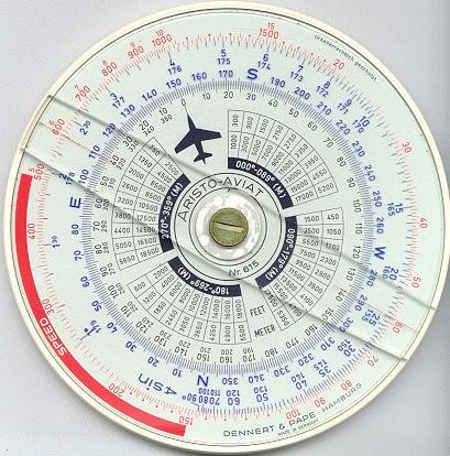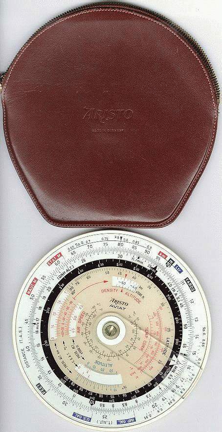 5.5" Circular Aviation Slide Rule Constructed with one rotating film disk, and rotating cursor on each side. A very sophisticated and beautiful flight computer for doing altitude, pressure, wind drift, time, temperature, and fuel problems. The rule gives simultaneous solutions in both metric and US/Imperial units, without being cluttered or hard to interpret, an outstanding mechanical and artistic design. Still in demand today among many pilots, but very hard to find. Made of 'Aristopal', comes complete with zippered leather pouch. We have had many requests for this rule from all over the world, this are the first 618's we have ever had available for sale, all in excellent condition. The similar 617 has an additional rotating wind arrow on the back face, not present on these models. The earlier 616 does not have the red reciprocal degrees printed on the rear compass rose, or the wind arrow.Comes with an english manual reprint, but we can supply the german manual if you prefer. (22 scales on front, Wind scales on rear) Front - see image Back - see image |