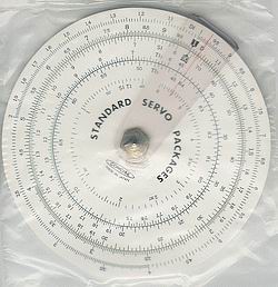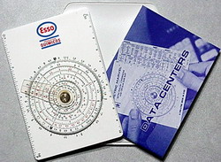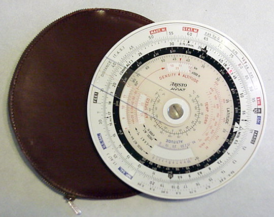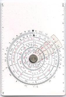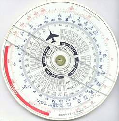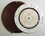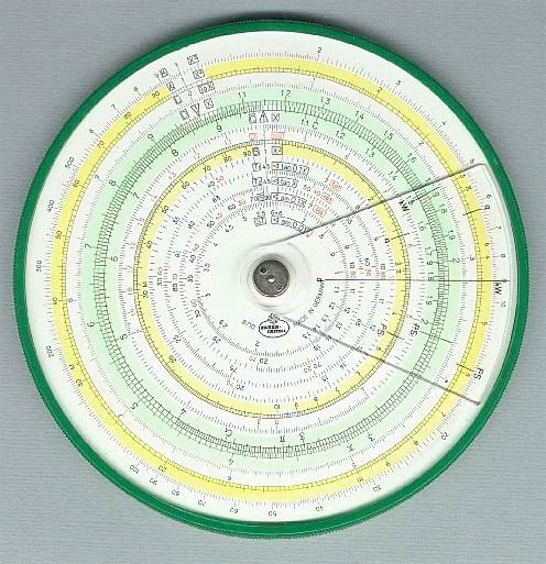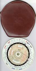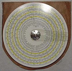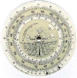 5.5" Circular Aviation Slide Rule Constructed with one rotating film disk, and rotating cursor on each side. A very sophisticated and beautiful flight computer for doing altitude, pressure, time, temperature, and fuel problems. The rule give simultaneous solutions in both metric and US/Imperial units, without being cluttered or hard to interpret, an outstanding mechanical and artistic design. Still in demand today among many pilots, but very hard to find. Made of 'Aristopal', comes complete with zippered leather pouch. We have had many requests for this rule from all over the world, this is the first one we have had available for sale in a year, excellent condition. The rule for sale IS NOT the rule pictured at right, but looks the same, except for minor variations in the the case (black or brown). A full english manual copy is included! We can also supply the german manual if you prefer. (22 scales on front, 6 scales on rear) Front - see image Back - see image |