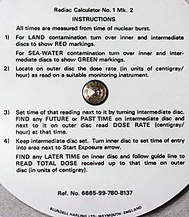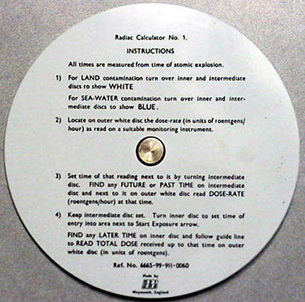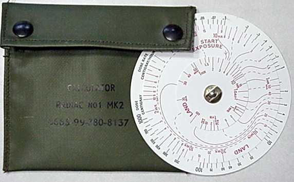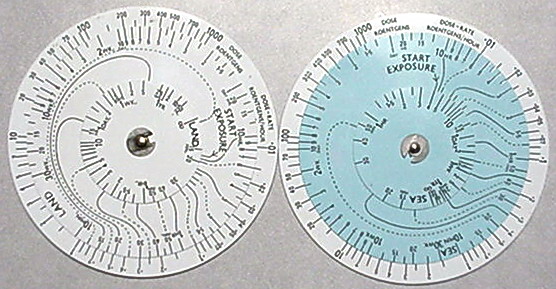 The set includes the rule with changeable disks, and snap closure pouch. Full instructions are on the rule reverse side. Interestingly, while it allows you to elegantly compute your radiatioon dosage, it does not say how much is fatal. An unfortunate oversight, if you should happen to really need to use this rule. |