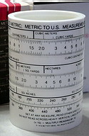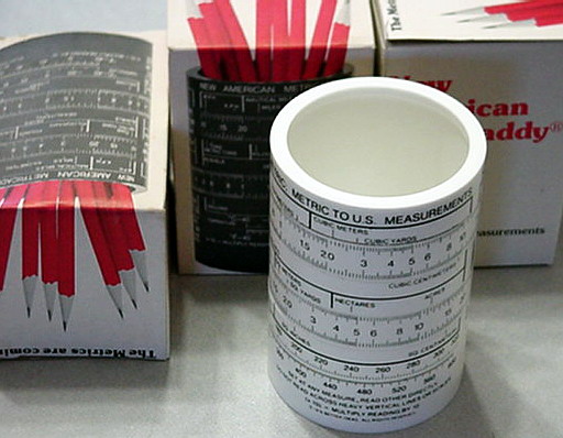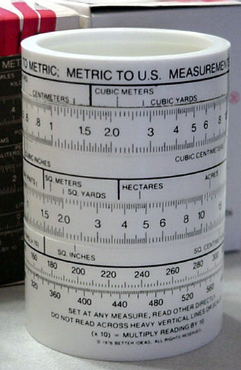 Yet another strange slide rule artifact from long ago. This pencil cup or desk caddy has two circular slide rule bands that rotate around the cup body, and perform US to metric unit conversions of all kinds. A surprisingly handy gizmo, these are new in the factory box, all are white with black text (this also exist in black with white text, and red with white text, but this is what we have). Converts temperature, length, weight, area, speed and volume. Impressive computing power for a pencil cup. (2 Rotating Bands, fixed temp scales) |