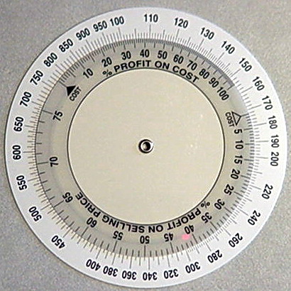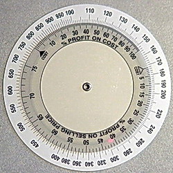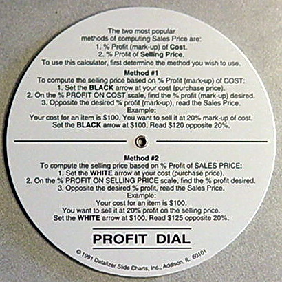 This shirt-pocket sized (4 inch) plastic Profit Dial is the most requested circular from business people, we now have them in small quantities (the normal buy is 500+ from Datalizer). This version does both profit on cost and profit on selling cost, making it very handy in any sales environment. These will be a stock item for us, so we can supply any quantity with some delay. Yes, Made in USA. (2 Scales, Instructions on Rear) |