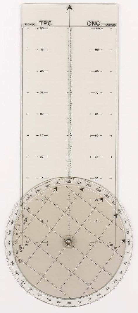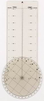 The compass rose is normally placed on a starting point on a chart orientated to north, then the scale is rotated to the desired course. The heading is read on the compass rose, and the milage is read on the TPC/ONC scale. If you wish to know more, e-mail Craig Kielhofer who is a pilot and can answer your questions. |