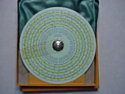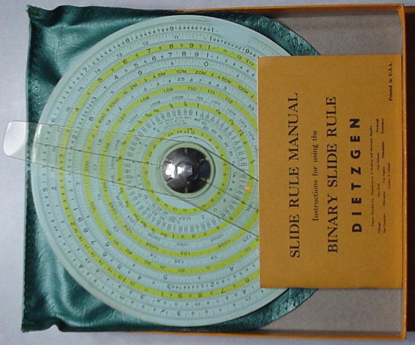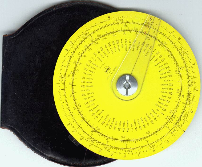 Gilson's most famous aluminum circular slide rule, with alternating yellow/white stripes and fractional converter/operator scales. This rule was made by Gilson in Florida but was also sold by numerous other companies, this is the Dietzgen version (slightly green tinted). This is a very powerful rule, with 3 sets of trig scales (sin/tan), giving performance equal to a much larger straight rule, and still has the factory box, and original printed manual. The rule has unique fractional 'binary' scales that permit operations directly with fractional numbers, and also drill size scales. Rotating dual cursors with a slip clutch on one side, and a single cursor on the other. The set offered IS NOT the exact rule pictured, but looks as good or better. (21 Scales !) |