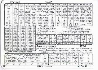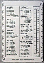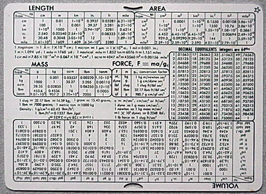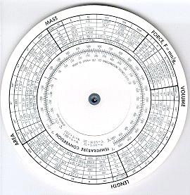 BRAND NEW, PERFECT, MINT CONDITION. A compact 2 1/2 inch pocket circular slide rule, attached to a rectangular data center card with pull-out insert. The rear side has a metric data conversion table, the center has a pull out unit conversion data chart with prefix terms. Ideal for those working with metric and imperial units. Very nice rule, complete with vinyl slip case and manual. BRAND NEW, complete with vinyl case and manual. (8 Scales, Side Rulers, Metric Data + Factor Conversion Data Card) |