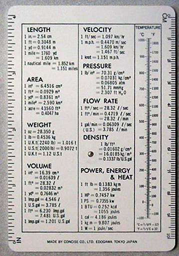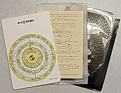 Brand NEW Sets, mint condition!. The Hope 740 is another custom rule made by Concise and marketed under another label, in this case Hope, who offered both circular and straight rules from Japan. The 740 is a metric converter built on the Concise data center 'chassis'. The front is a compact 3 inch pocket circular slide rule, attached to a rectangular data center card (with side inch/cm rulers on the back). The rear side has a C/F temperature scale, inch and centimeter rulers and a nice table of constants. A very handy rule for quick conversions of temperature, length, volume, weight and area, PLUS an extra C/D scale set for general calculations. Complete with black/clear vinyl slip case, and short factory manual, all in MINT CONDITION! This ia a very nice looking item from Concise that will be very handy in your shirt pocket! (4 Scales, 2 back rulers, Constants) |