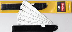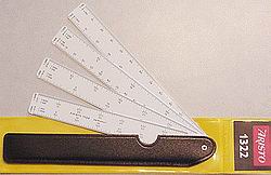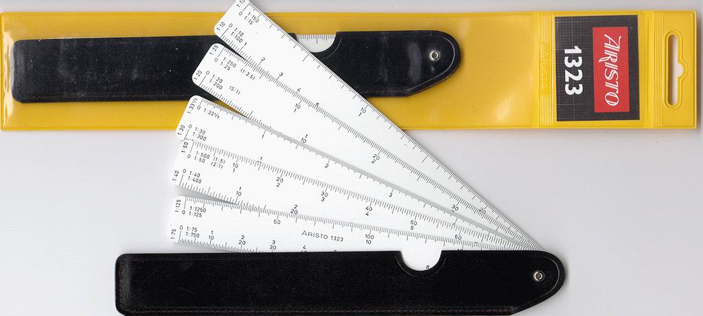Model 1323 Aristo plastic folding scale set Brand new collapsable scale set, fresh from the FACTORY! Unique and useful design. Metric scale (15cm long scales) set has ratios from 1:5 to 1:1250 in 9 dual and 1 single scales on 5 blades. Folds into a very nice, slim black leather case. A beautiful scale set in every way. We just got set up with Aristo to offer these incredibly useful scales again. We can get large quantities at a good discount. Scales: 1:10, 1:15, 1:20, 1:25, 1:30, 1:33-1/3, 1:40, 1:50, 1:75, 1:100, 1:125, 1:150, 1:200, 1:250, 1:300, 1:400, 1:500, 1:750, 1:1250 also 2:1, 2.5:1, 5:1 (5 blades/10 scales) |