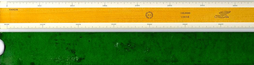 Beautiful Paragon Chain Scale Map Rule Boxwood construction, with engine divided (chain division, full length) laminated scales. Large scale, 1/2 meter in length, made for USCE, ratio of 1:10,000 with one edge yards, one meters. Look new, includes protective green paper sleeve. Picture shows the worst green sleeve, and only partial scale length, won't all fit on the scanner. These are extremely attractive rules. (2 scales) |
