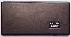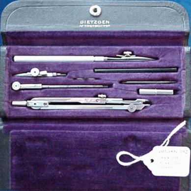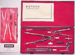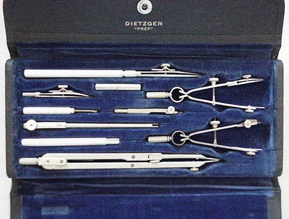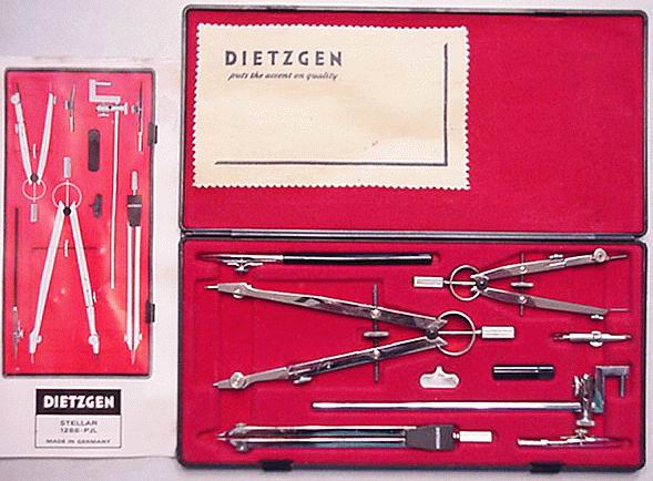DIETZGENModel 1288-PJL Dietzgen Stellar drafting set Excellent condition late production set, clean tools and case in red velvet lined folding plastic case with latches. Includes 5 inch divider, 5 inch bow head compass with pen/pencil tip and extension bar, 3 1/2 inch bow head compass, drawing pen, spare parts, cleaning cloth, manual and tools. All tools are made in Japan, and are free of any marks or rust with little use, the case is excellent condition. An outstanding, lightly used set in an excellent case. (4 major pieces, plus accessories) |