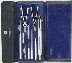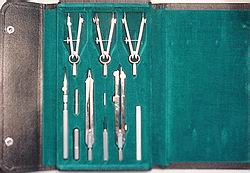 Pens: Case, 6 scales, 6 pens, Leroy pantograph (scriber), hand holder |