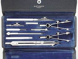 Full Model 1092 Constructo Dietzgen drafting set Excellent condition set, clean tools and case in deep purple velvet lined folding case. Includes compass with pen and pencil tips, extension arm, drawing pen, spare parts, and tool. All tools are made in Germany, and are free of any marks or rust, the case is excellent condition. An outstanding unused set, with no missing pieces. (2 major pieces, plus accessories) |