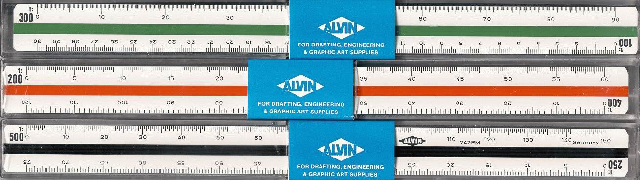 ALVIN 742PM Excellent condition new triangular rules, classic 3-sided plastic rules with molded scales. Very attractive rules. Scales are 1:100/1:300, 1:250/1:500, 1:200/1:400. Made in Germany. Has clear lucite 2-part case. (6 scales) |