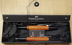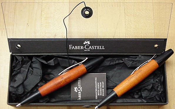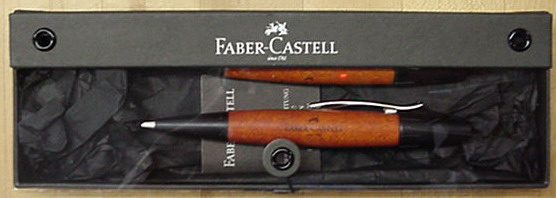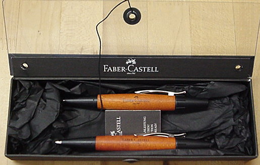 ![]() Faber Castell Limited Edition Wood Pen Set Beautiful limited edition desiger pen/pencil sets from Faber Castell, turned wood bodies with black trim. Beautfully packed current production sets in see-though gift packages. We managed to get a few sets from Europe for FC fans. (Mechanical Pencil, (Black) Ball Point Pen) |
