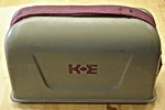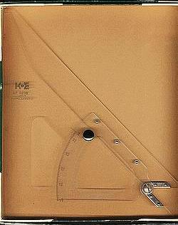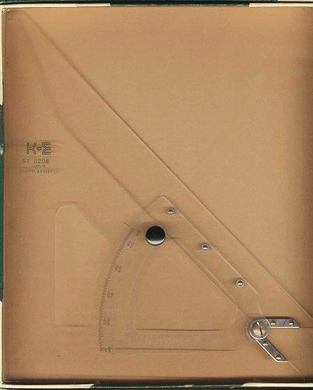 Excellent condition 10 inch triangle, still has the original K+E box, but the box has tape on the corners. Has a 45 degree adjustment range, which permits 0-45 degrees and 45-90 degrees (by rotating the triangle). A very handy tool for making accurate angle lines that are something other than the normal 30/45/60 increments. Triangle and Box |