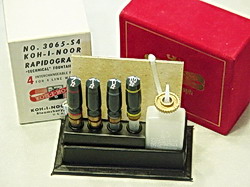 KOH-I-NOOR Late Production 3065-S4 Rapidograph Pen Set, complete with display box Mint condition new set, still in original factory box. Contains 4 standard pens with reservoirs No. 00, No. 0, No. 1 and No. 2. Also has 1 pen handle, 1 pen wrench, desk stand, plus ink/cleaner bottle (empty). A truly beautiful set. We get constant inquiries for these sets, but have had real trouble finding good ones. This perfect, never used set should not be missed if you do a lot of pen or lettering work. 4 Pens |