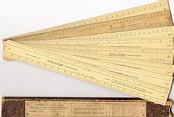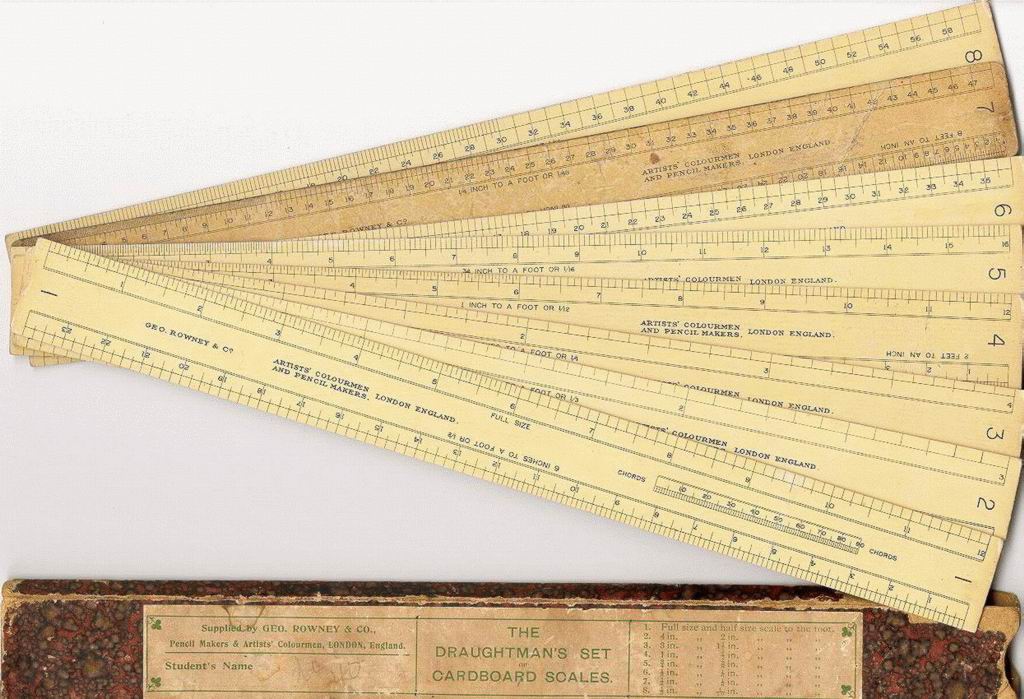 The Draughtman's Set of Cardboard Scales Very old set of Geo. Rowney and Co. Paper Scales, 8 pieces with different scale factors, and box case. Made in London, England, age unknown. |