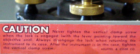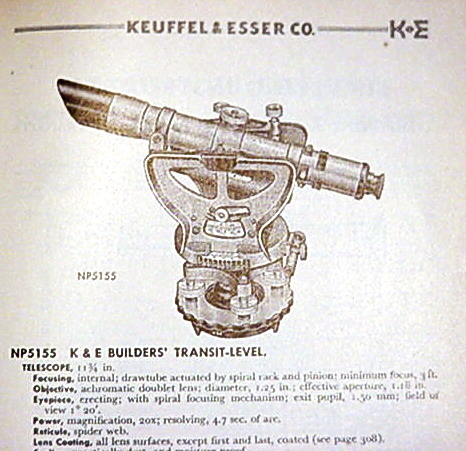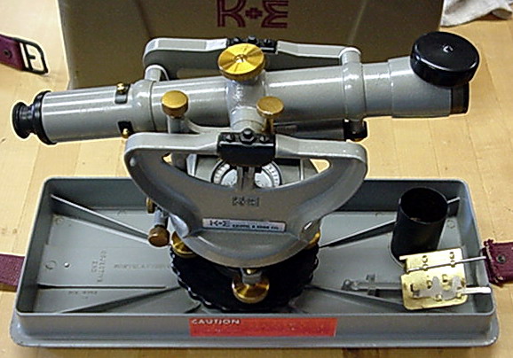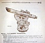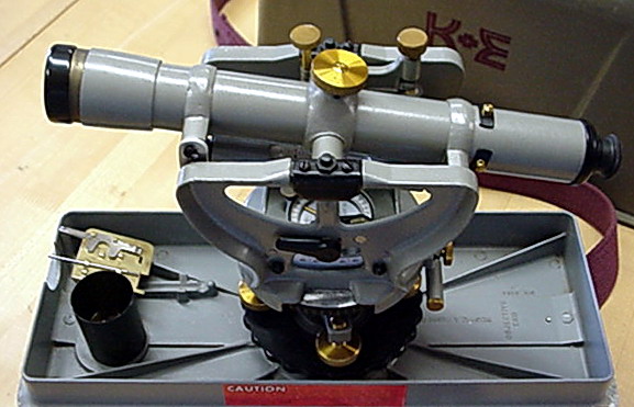 K+E Transit c/w CaseExcellent condition transit with fiberglass/aluminum transit case, has cross style reticle, center compass with stowing mechanism, and accessories. Our best match to a K+E catalog Transit is the NP5155 Builder's Transit/Level, but it is not identical to the catalog picture (possibly different year of manufacture). There is no model number anywhere on this unit, only the K+E logo and serial number. Optics look good when sighted, top focus knob works smoothly, and rear lens adjustment for the reticle work great. I was able to get a crisp distant image and reticle both with no problem, but we have no way to judge the over-all accuracy or calibration, so the unit is sold in as-is condition. Note the storage caution label HERE. Side setting adjustment scales are HERE. |
