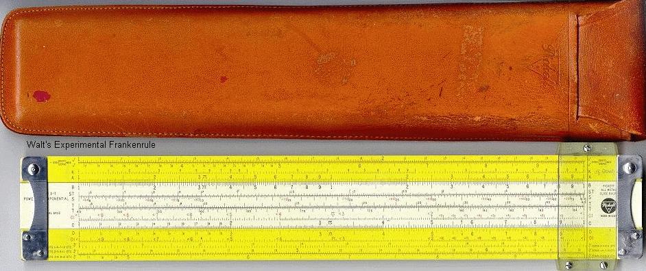Walt's Experimental Frankenrule... This all started innocently enough, I bought a Picket N3ES (sigh) in VERY GOOD condition. When it arrived, it had the previous owner's initials on every single part of the rule. It also had pieces of cardboard jammed under the filthy and horribly scratched (and initialed) lenses in an attempt to make it work better. Both sides of the cursor, the end brackets, all over the slide, you name it, had his initials on it. It would appear to me the previous owner had a problem with trust at some level. Anyway, the rule was a disaster, and just by the way, had no case. I kept looking at it, and started to speculate on what I could do to make it less of a nightmare. Finally, I ripped the rule completely apart, and decided the slide was just unsavable. I happened to have another N3T broken apart for other reasons (all equally serious), and found the slide could be aligned perfectly to the N3ES body with a bit of work to make the action smooth. I made a complete new cursor from parts, and took a fine wire wheel to the hideously marked up end braces until all the corrosion and the dreaded initials were gone. After a long scrub, clean, and massive guideway polishing, the rule actually worked again, and looked pretty good in a chromatically impaired sort of way. I had no case, but had an extra leftover case from an N500 (the unhappy victim of some savage dymo tape removal) to work with, but it was too narrow. I discovered that if the internal plastic sleeve was removed, the case flattened out, and the much wider N3T/ES body fit inside neatly. Ooohh, aaahhhh. The two now co-exist together happily as evidence that it is possible to transform landfill material into a workable slide rule, if you have a few days to kill. |