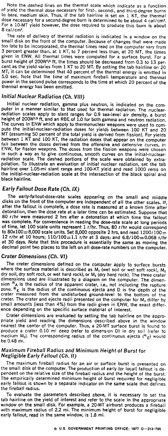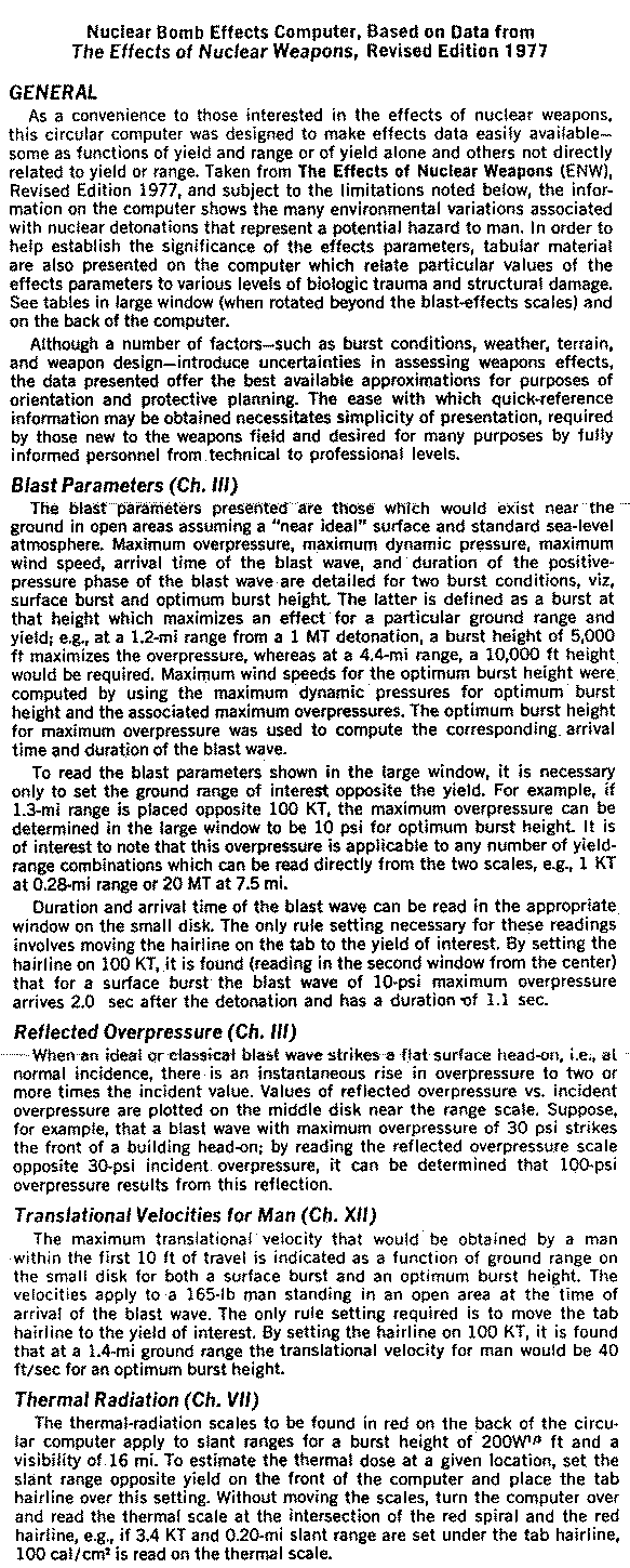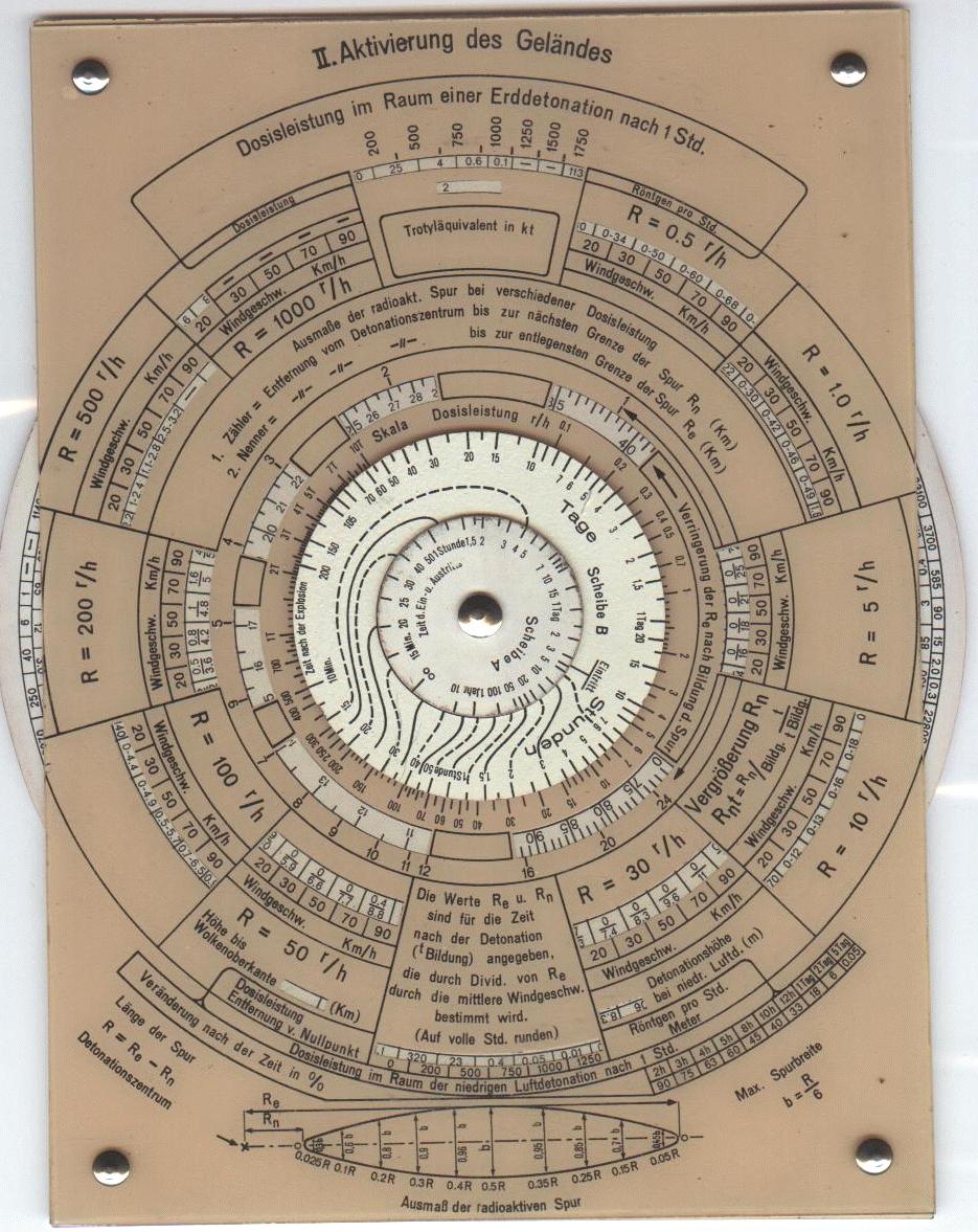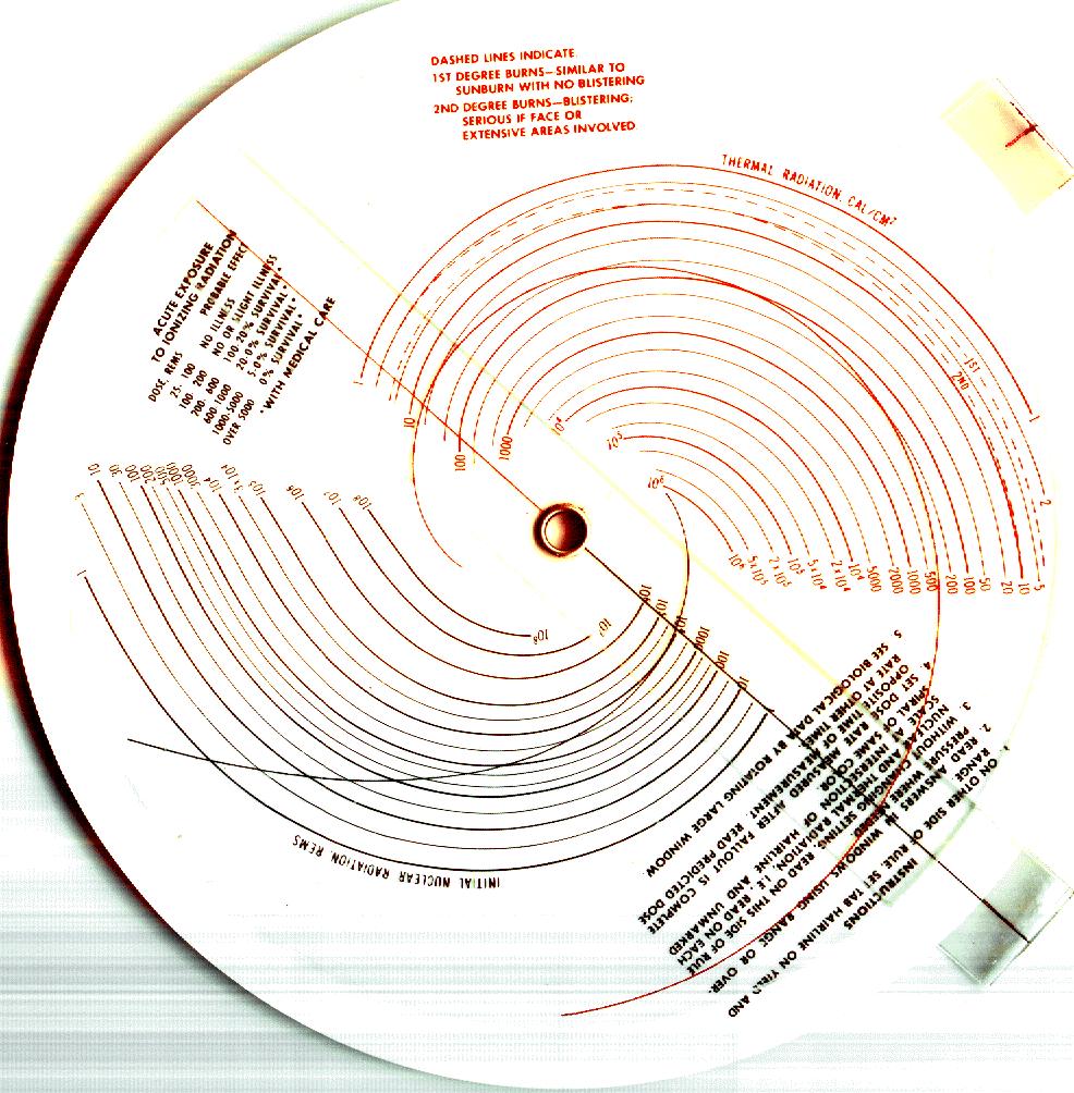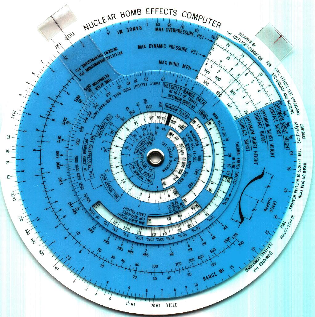 Want to know the blast pressure of your favorite size atomic device 1000 meters from ground zero? Need to know the optimum burst height for that new nuke you just bought? How about the high confidence kill zone radius, or temperature at some exact distance from the nuclear weapon that just went off down the block? These babies can answer all those burning questions as you get flambéd into free ions and radioactive dust at about 1,300MPH. The perfect gift for people who still think nuclear war is winnable and appealing, and want to be precise in their calculations to prove it. CLICK HERE and HERE to read the instructions, and learn how to calculate translational body velocity and crater size. The stylish blue one is from Larry (did they come in decorator colors?), the Tan one is from John (sorry, the text is in German, we will try and get a translated listing of the scale names). |