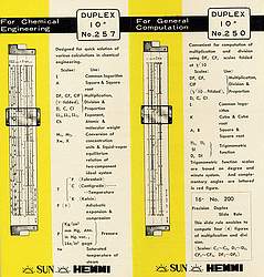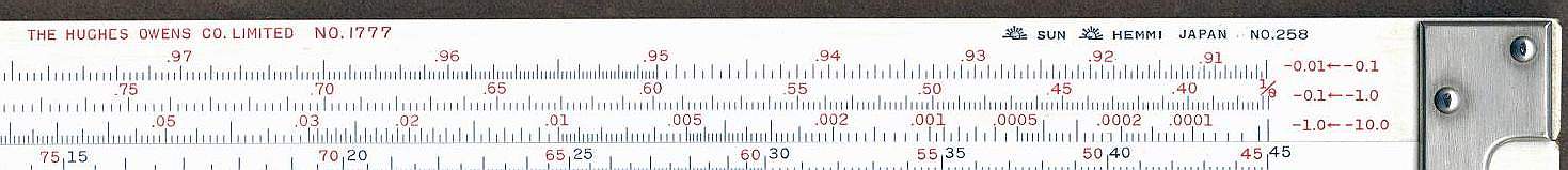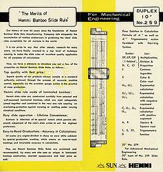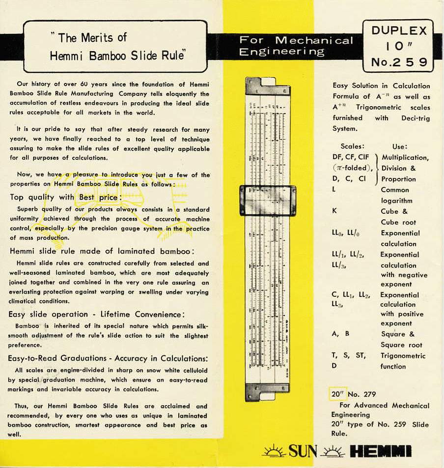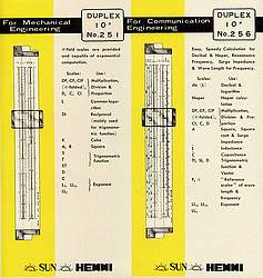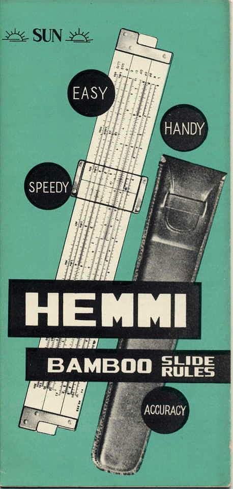 Hemmi Bamboo Slide Rule Manufacturing Company Ltd. (Hemmi Keisanjaku) in Japan produced a wide range of slide rules under their own SUN logo, and for makers around the world, including the famous POST Versalog, which can be seen here in its original Model 258 form. Hemmi made most of POST's rules from the 1930's on (except for a period during the second world war), rules for Lietz, and rules for Canada's Hughes-Owens and Geotec. Visual comparisons and country of origin markings also suggest they may have made plastic body rules for Steadtler-Mars, Sterling and Dietzgen.
