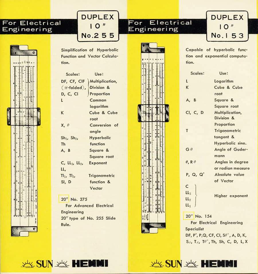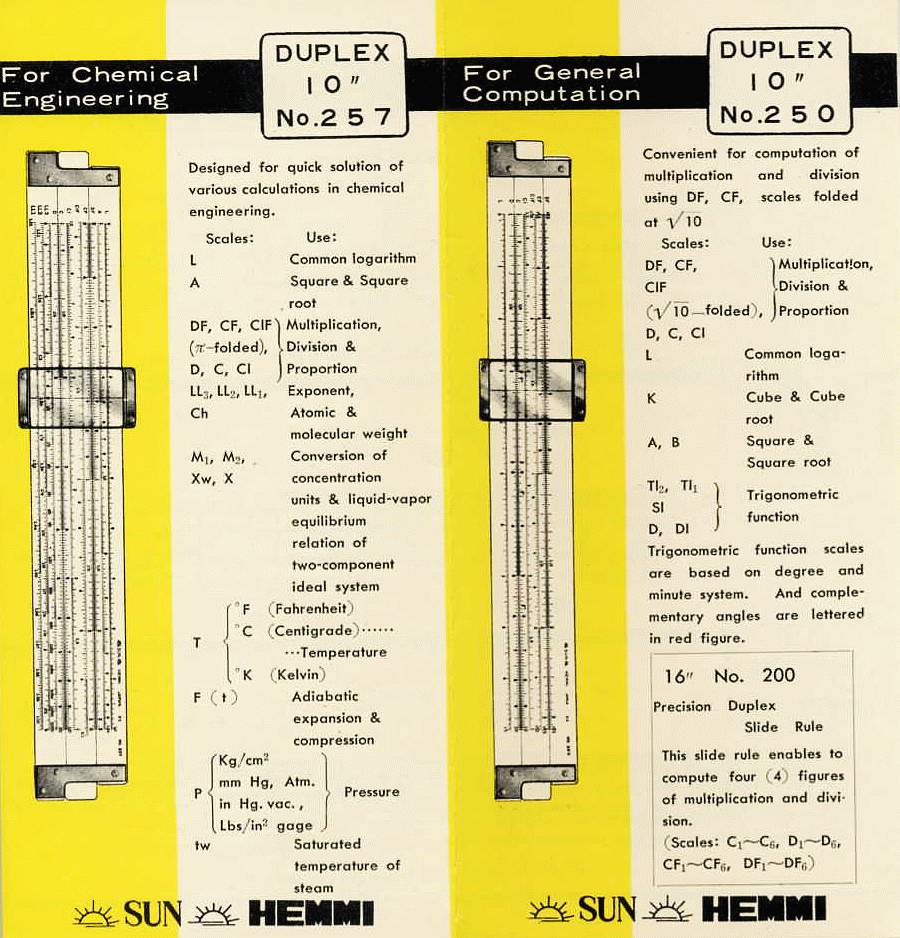 Hemmi made rules for many special purposes, including civil engineering/surveying, chemical engineering, electronics, physics and mechanical engineering. Their special purpose rules, like the 266 electronics rule and 257L chemical rule are some of the best ever made, and are still highly sought after today as working rules. Their designs were very practical, and unlike north american makers, self documenting as much as possible in later plastic body designs, making them far easier to understand and use. Compared to the Pickett N16 for example (the rule Pickett promoted as an electronics rule), the Hemmi 266 is far easier to use, has many more useful electronic functions, and does a much better job of decimal keeping in the answers and set up.