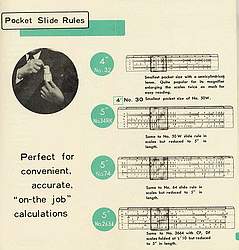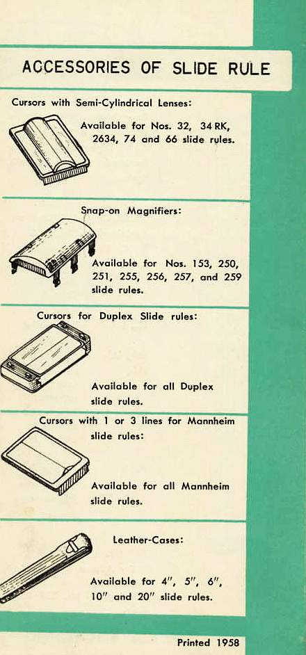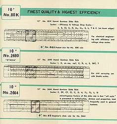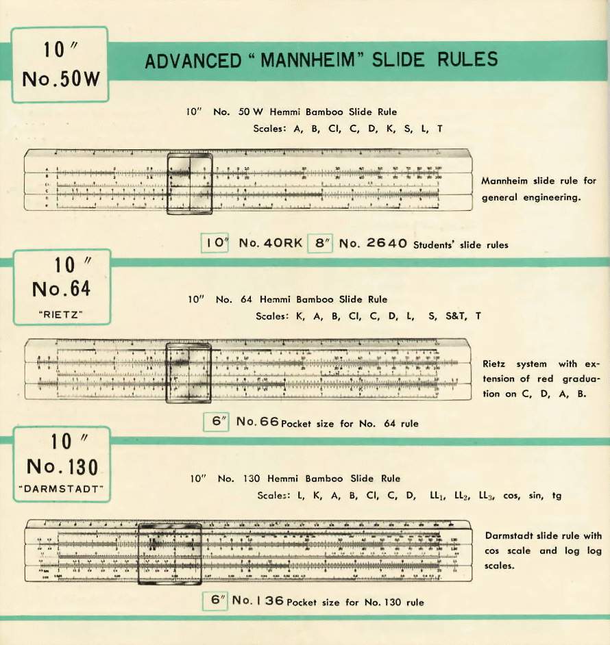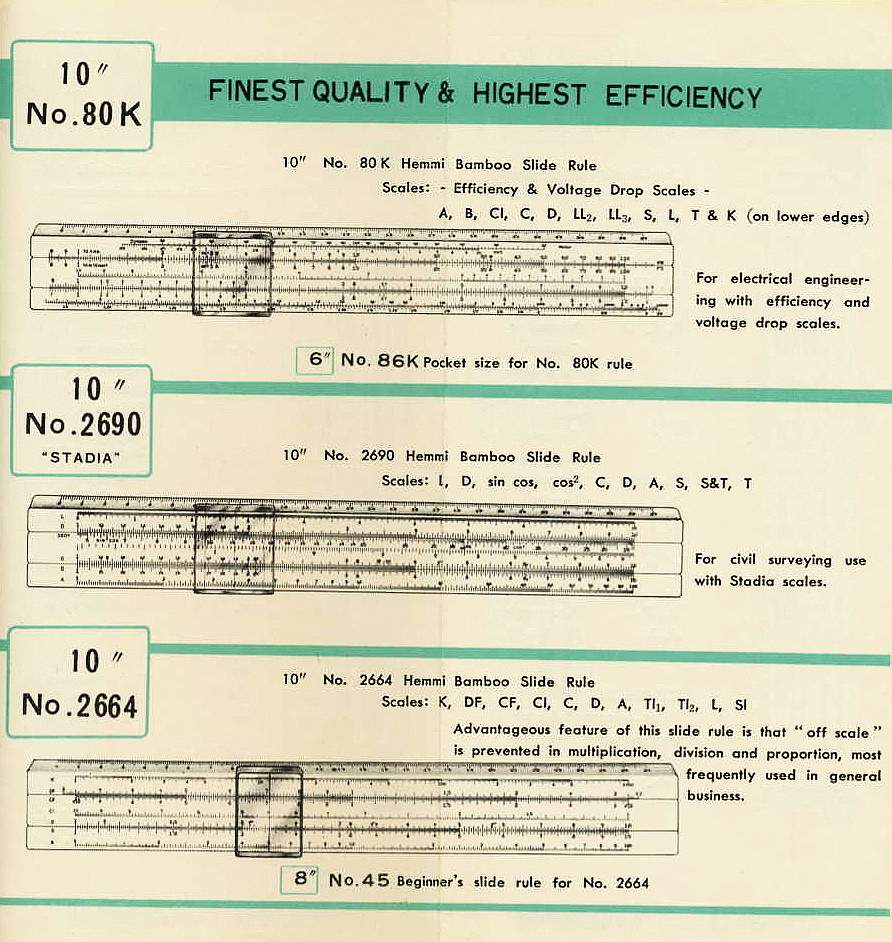 Hemmi's plastic body rules often had striking color accents, with blue or green tinted slides and end braces with white bodies. Unlike some other makers, their plastic rules were as good in terms of craftsmanship and appearance as their bamboo body rules, and were often very complex designs. Hemmi still exists today in Japan, but makes hydraulic valves and related industrial products, still under the same name. They no longer make slide rules, but do have some old stock that can still be bought. Thanks to Mark Fletcher, we now have full details of Hemmi's 1958 sales catalog, which describes all their major rules and features in illustrated form.