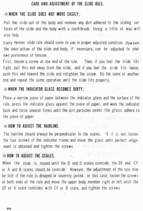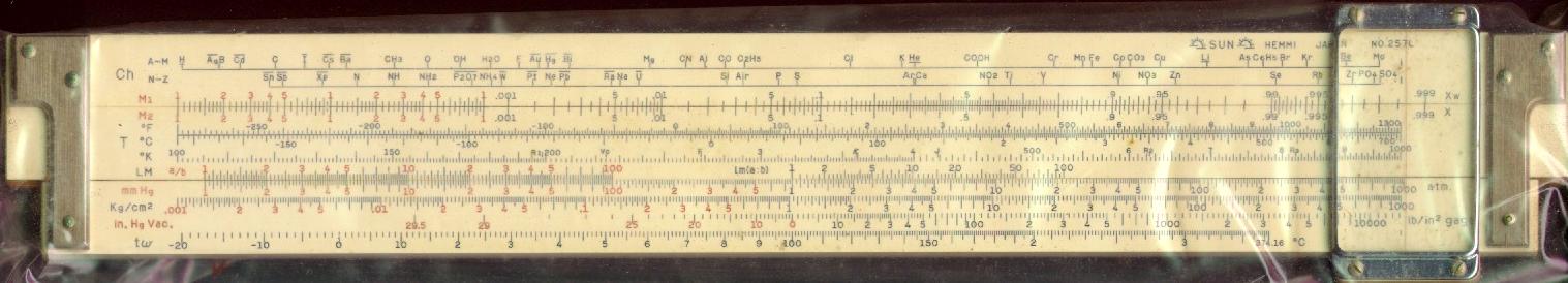 To see a complete detailed operating Guide from Hemmi (for the 257 Chemical Rule, CLICK HERE. This covers general Log Log duplex rule operation, and the specialized chemical scales. To see Hemmi's own CARE INSTRUCTIONS FOR BAMBOO RULES, CLICK HERE.