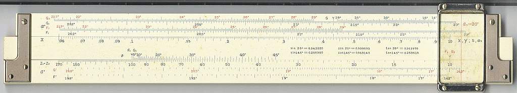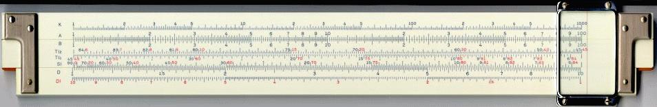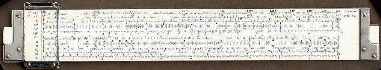 Extended size duplex bamboo body rule, 2 part hardboard case case, with full manual. Capable of higher accuracy due to increased scale length. White celluloid scales, adjustable end braces. Has hyperbolic sine and tangent scales. Folded scales (DF, CF, CIF) at pi. (23 Scales)