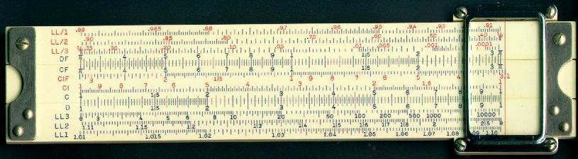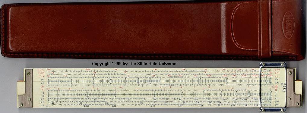 Duplex bamboo body rule, 2 part hardboard case or leather case, with full manual. White celluloid scales, adjustable end braces. Has full log log scales and a P (Pythagorean) scale, plus DI. Scales are self-documenting on the right hand side of the rule face. Folded scales (DF, CF, CIF) at pi. (25 Scales)