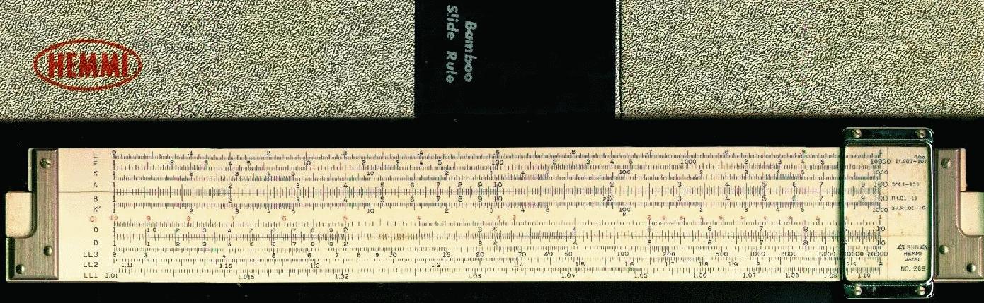 Bamboo rule shown with with Hemmi factory box, hard case, and manual. Very unusual rule and scale arrangement, it has 4 log-log scales on reverse, plus the P (pythagorean) scale, BI inverted scale and over-range scale extensions. Reverse also has equivalence and setting tables.