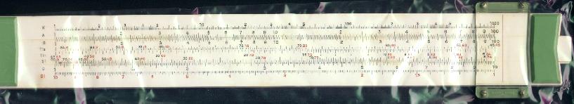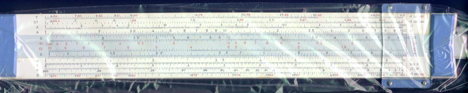 Duplex plastic body rule and clear display case, with full manual. Similar construction to the P261/262, but body and slide are the same color. Two color scales and unbreakable cursor, with green end braces. Interesting folded scales (DF, CF, CIF) include both pi and the square root of 10, and DI scale is included on the body. (18 Scales)