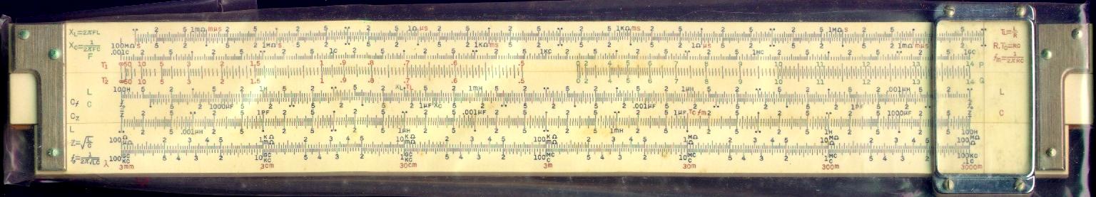 Powerful and classic Bamboo duplex rule with Hemmi 2 part hard case, complete with manual. These rules were not seen in North America very often (REALLY too bad), but provide a wealth of specialized electronic calculations, including dB, Xc, XL, Frequency, impedance, wavelength, and a full function log log rule on the reverse. Very impressive rule, with self-documenting scales and quite uncommon. Dual marked scales for some functions.