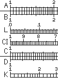 This diagram illustrates a slide rule with a very small-scale log-log scale, matching the K scale. Usually, the log-log scale shown here would instead be broken into three pieces, called LL1, LL2, and LL3, matching the C scale. The coarse resolution of the diagram above, and its small scale, shows the mark for 1.001 on the LL scale coinciding with the 1 on the K scale, but when the scale is made to correspond with the C scale, on a real 10 inch slide rule, a fourth piece, extending from 1.0001 to 1.001, called the LL0 scale, is worthwhile to provide, even if, for smaller numbers, the D scale will serve.