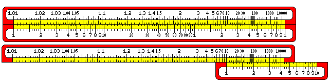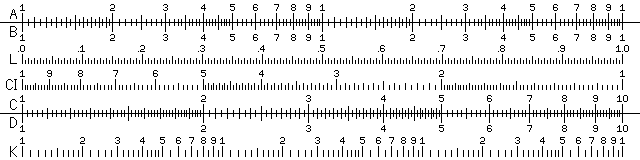 For the other diagrams on this page, one copy of the scale from the K scale was used to represent the C and D scales, and a slightly smaller scale was used, so that the distance between 1 and 2 was exactly 53 pixels, and the distance between 1 and 10 was 176 pixels. (The same program drew the log-log scale used in the diagrams above; instead of replying 600 to the prompt for the width of the slide rule, I replied 528, which is three times 176, to obtain the raw materials for those diagrams.) Thus, while the irregularity in the spacing of the ticks could not be eliminated, at least it repeated at convenient intervals so that the rules could be shown sliding against each other in diagrams which gave a reasonable appearance without having to cheat by shifting some of the ticks by hand from their calculated positions. (I had tried other possibilities, involving approximations only to log(2), but because that is 0.3010299... rational approximations to it, while good, are widely spaced, or involving computer searches for ratios that minimize error over all the tick marks, but they were not as successful.)
