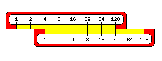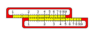 Here we see two slide rule scales set up to multiply the numbers on the bottom scale by 2. Thus, 1 was placed under the 2; therefore, 2 is under the 4, 3 is under the 6, 4 is under the 8, and 5 is under the 10.