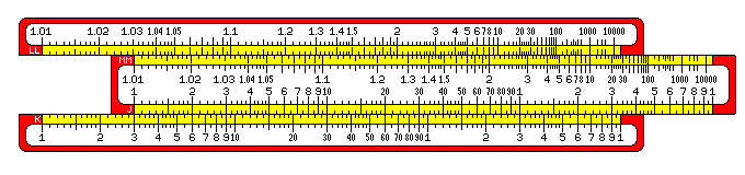 This would let the K scale itself stand in for a lower extension of the LL scale, dealing with numbers like 1.001, 1.0001, and 1.00001. So the LL scale is aligned to facilitate that; 1.01 is placed near the index, instead of 10 being placed directly over 100 on the K scale.
