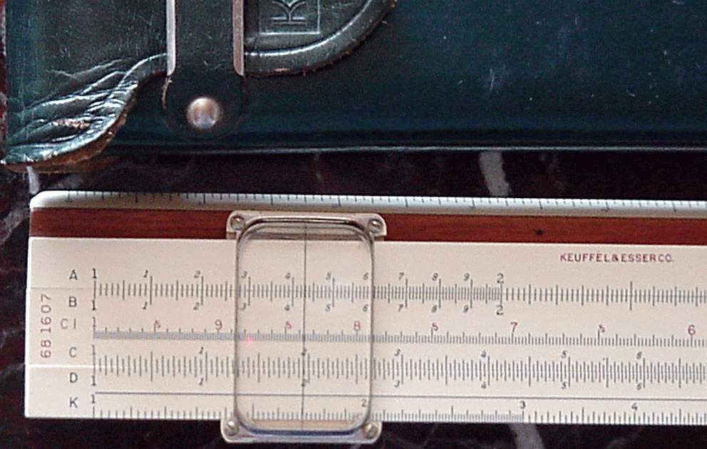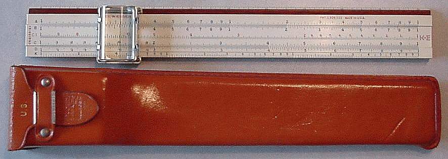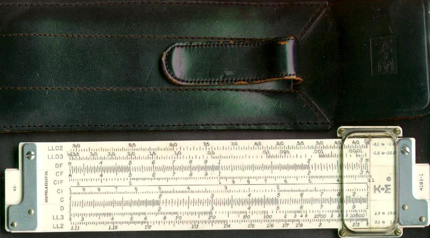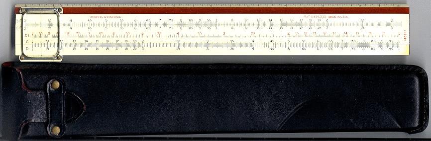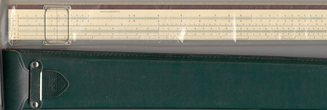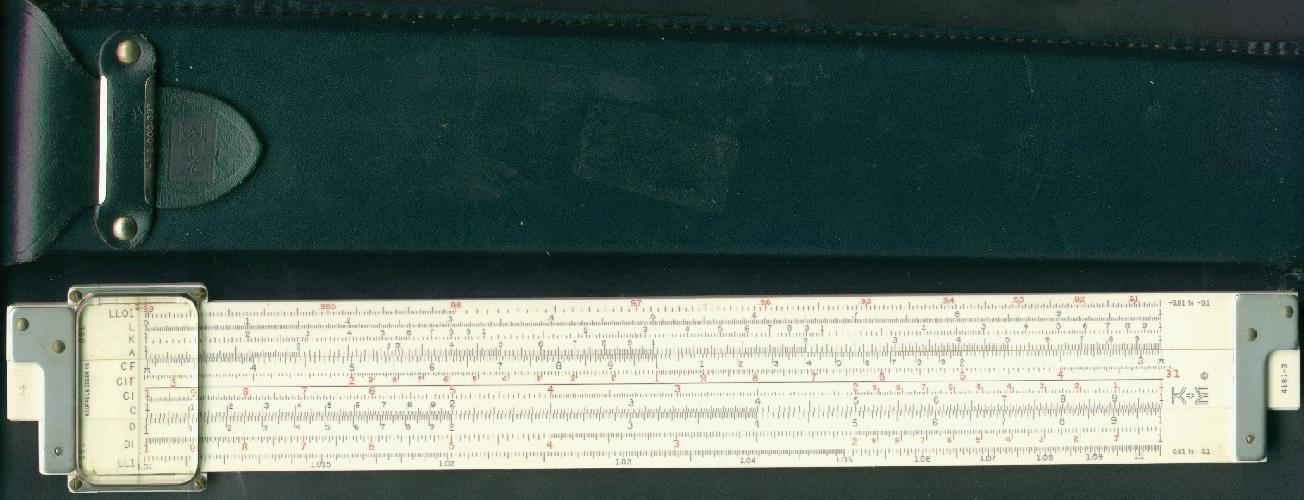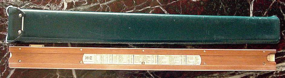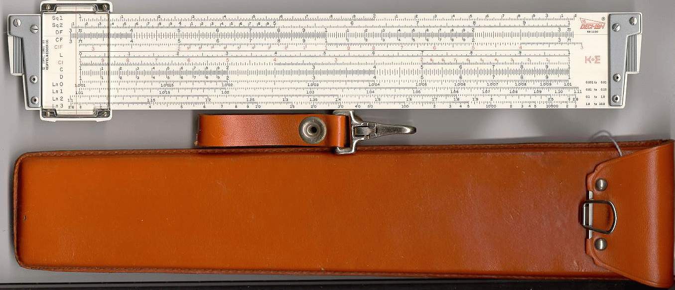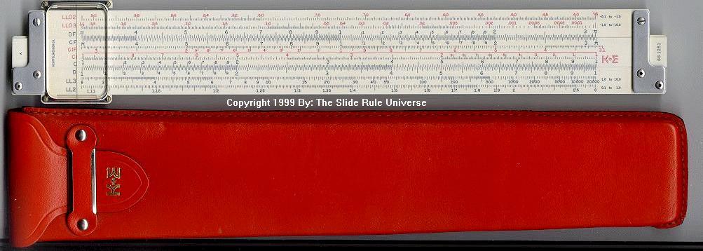 LL01, L, K, A, [ B, T, SRT, S, ] D, DI, LL1 Improved cursor, leather case. Appears to be a re-numbered 4081-3 rule, complete with sewn leather case, in a set, the rule is still numbered 68-1210. |