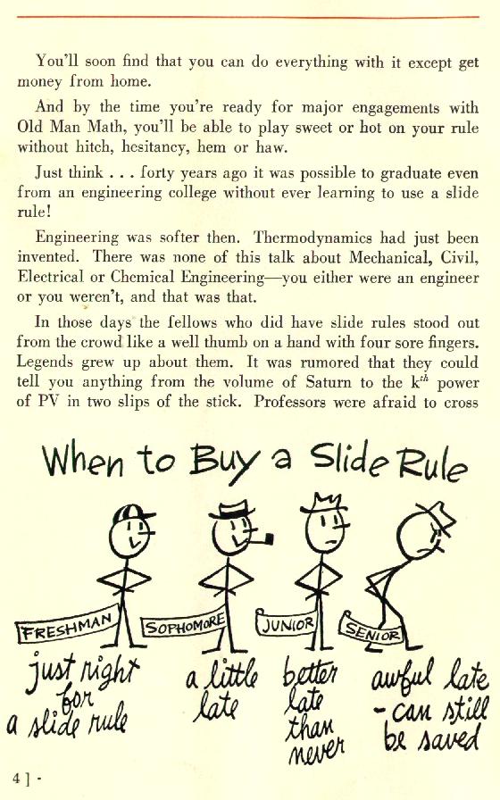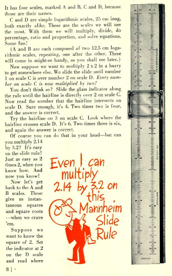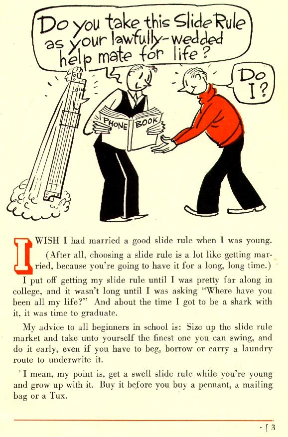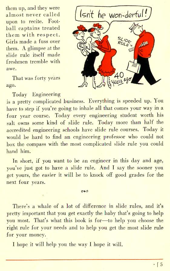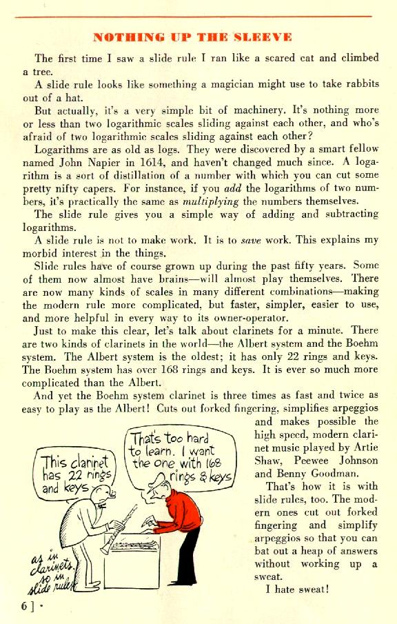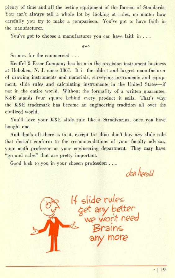 ![]() Take a tour through 1940 with K+E and Don Herold, and see how to select a slide rule. An incredible look back though time. This free introductory booklet, published and copyright in 1940 by K+E is a great explanation of how a rule works, what it's good for, and which rules are used for what purpose. After more than 60 years, it's still an amazing and useful piece of information. It is reproduced here exactly as it appeared in 1940 (except the blank spacer pages), including the short K+E catalog at the rear. Just CLICK on the link to each page to see it. Each page is about 100K, the entire booklet is about 2.4Mb. It is worth the wait to see it. Use your browser RETURN to come back after each page, and you can print each one via your browser to make a booklet copy for review. We believe this document is now in the public domain (over 50 years from the date of the corporate copyright date), and was free in any case, but if we are incorrect, please advise, and we will remove it immediately. Don Herold's style in this booklet is wonderful, and should not be missed by any real slide rule fan! Visit Other Pages On Our Site! |