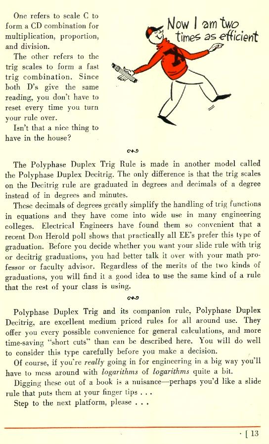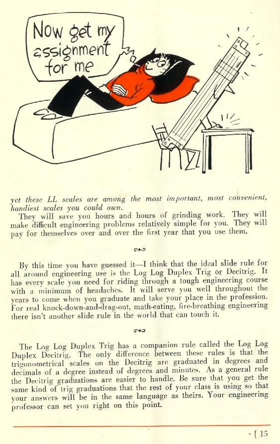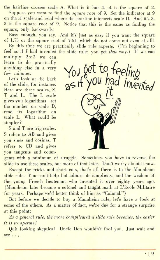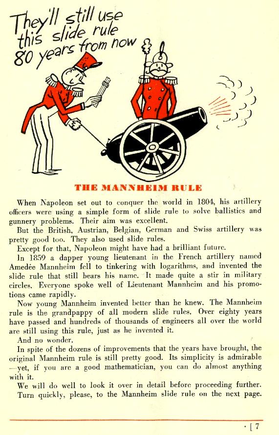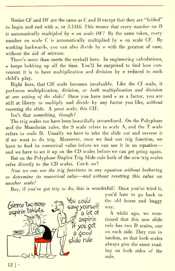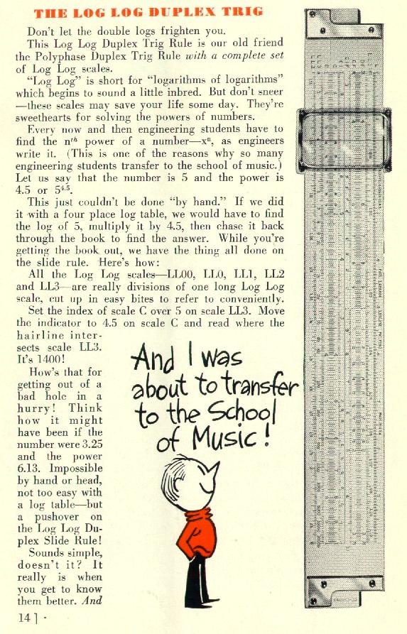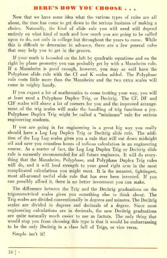 ![]() Take a tour through 1940 with K+E and Don Herold, and see how to select a slide rule. An incredible look back though time. This free introductory booklet, published and copyright in 1940 by K+E is a great explanation of how a rule works, what it's good for, and which rules are used for what purpose. After more than 60 years, it's still an amazing and useful piece of information. It is reproduced here exactly as it appeared in 1940 (except the blank spacer pages), including the short K+E catalog at the rear. Just CLICK on the link to each page to see it. Each page is about 100K, the entire booklet is about 2.4Mb. It is worth the wait to see it. Use your browser RETURN to come back after each page, and you can print each one via your browser to make a booklet copy for review. We believe this document is now in the public domain (over 50 years from the date of the corporate copyright date), and was free in any case, but if we are incorrect, please advise, and we will remove it immediately. Don Herold's style in this booklet is wonderful, and should not be missed by any real slide rule fan! Visit Other Pages On Our Site! |