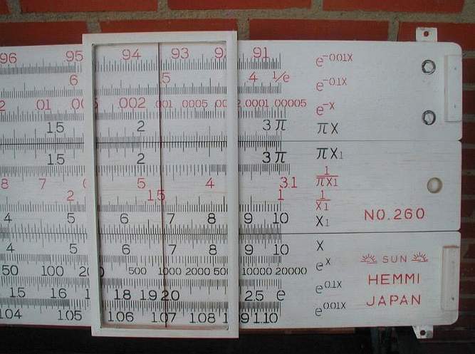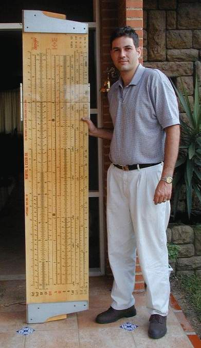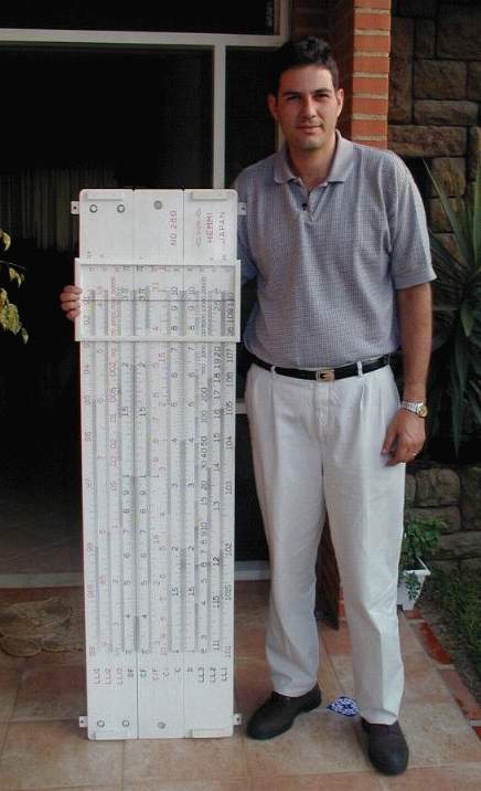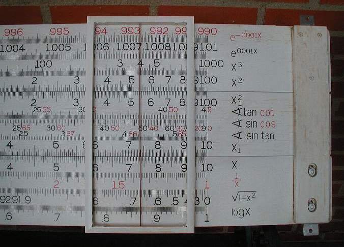![]() 5 and 6 Foot Display Rules from Venezuela!Two amazing finds discovered by collector Amedeo Muscelli, found neglected in local Venezuelan shops. The 5 foot overall Hemmi 260 slide rule is made of wood and painted with an air brush using a template. The cursor is a one sided frame with a wire in the middle, this frame work hooked onto the top of the rule and had to be rehung when the rule was reversed. The K+E 68-1100 Deci-lon is also a painted wooden duplex rule, with a fully working moveable plexiglass cursor. |