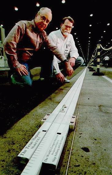 352 Foot Working rule!An amazing bit of applied science created by Skip Solberg and Jay Francis, and now enshrined in the Guiness Book of World Records! This newspaper clipping tells most of the story pretty well. Early reports are 5 place accuracy, with the ability to resolve 6 places if the heavens are in correct alignment. Needless to say, they are from Texas. I wonder what the case looks like?Is there a belt loop? See also THIS SECTION for a late breaking report on WHY this rule was actually made and where it wound up.... |